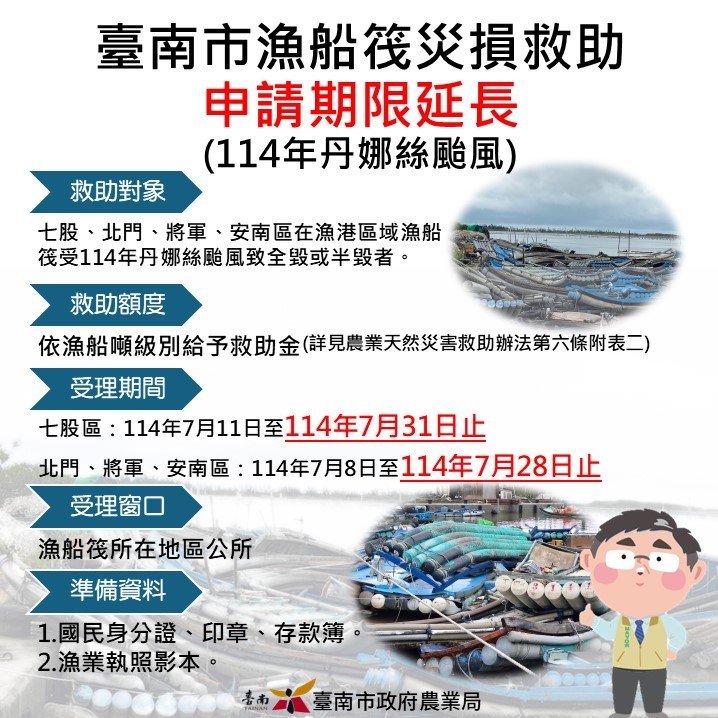 【透傳媒記者杜忠聰/臺南報導】中度颱風丹娜絲重創臺南市漁港區域漁船筏,造成嚴重災損。農業部已公告七股區、北門區、將軍區、安南區漁港區域漁船筏為漁業天然災害現金救助及低利貸款地區,並於 7 月 14 日再次公告延長申請期限。