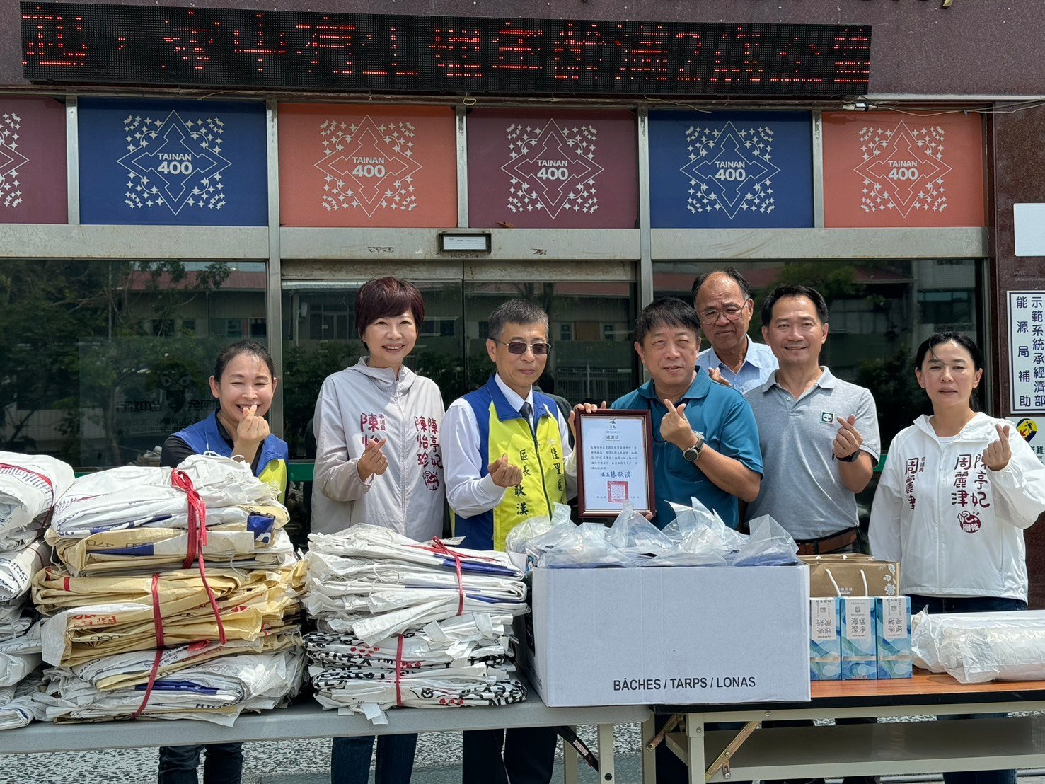 此次捐贈的物資包括 4.8×3.4 公尺帆布 12 塊、編織袋 1500 個、PVC 布 5 捲,由佳里區區長林耿漢代表接受,供災區第一線使用,幫助鄉親整頓受損家園。