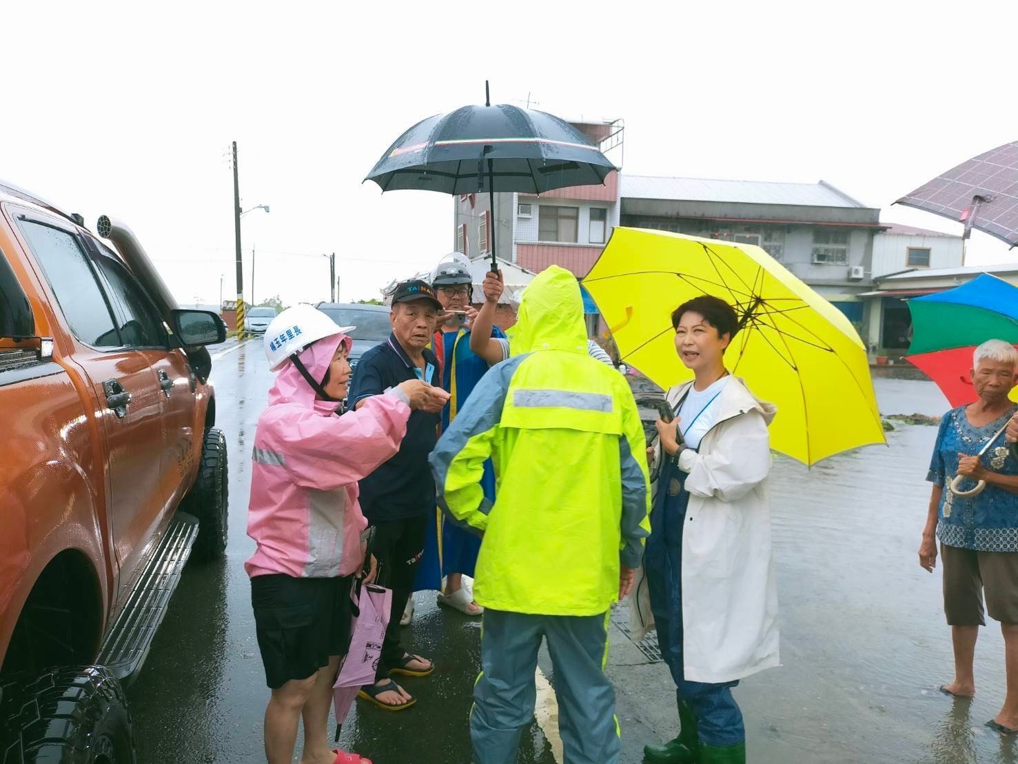 勘災過程中,陳亭妃立即要求市府加強抽水與排水調度,並與里長保持密切合作。她的團隊還準備了便當,隨時為有需求的民眾提供幫助。