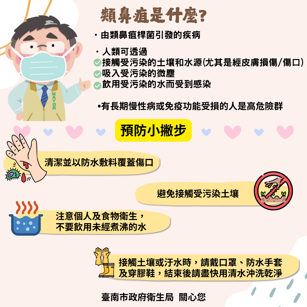 衛生局李翠鳳局長表示,類鼻疽潛伏期平均 9 天,短則數小時,長達 21 天。豪雨後易有污水等,提醒市民清理時穿雨鞋、戴防水手套及口罩,避免皮膚直接接觸污泥土或污水,有傷口者接觸後要盡快清洗。如有不適儘速就醫,醫療院所發現疑似病例要立即通報。