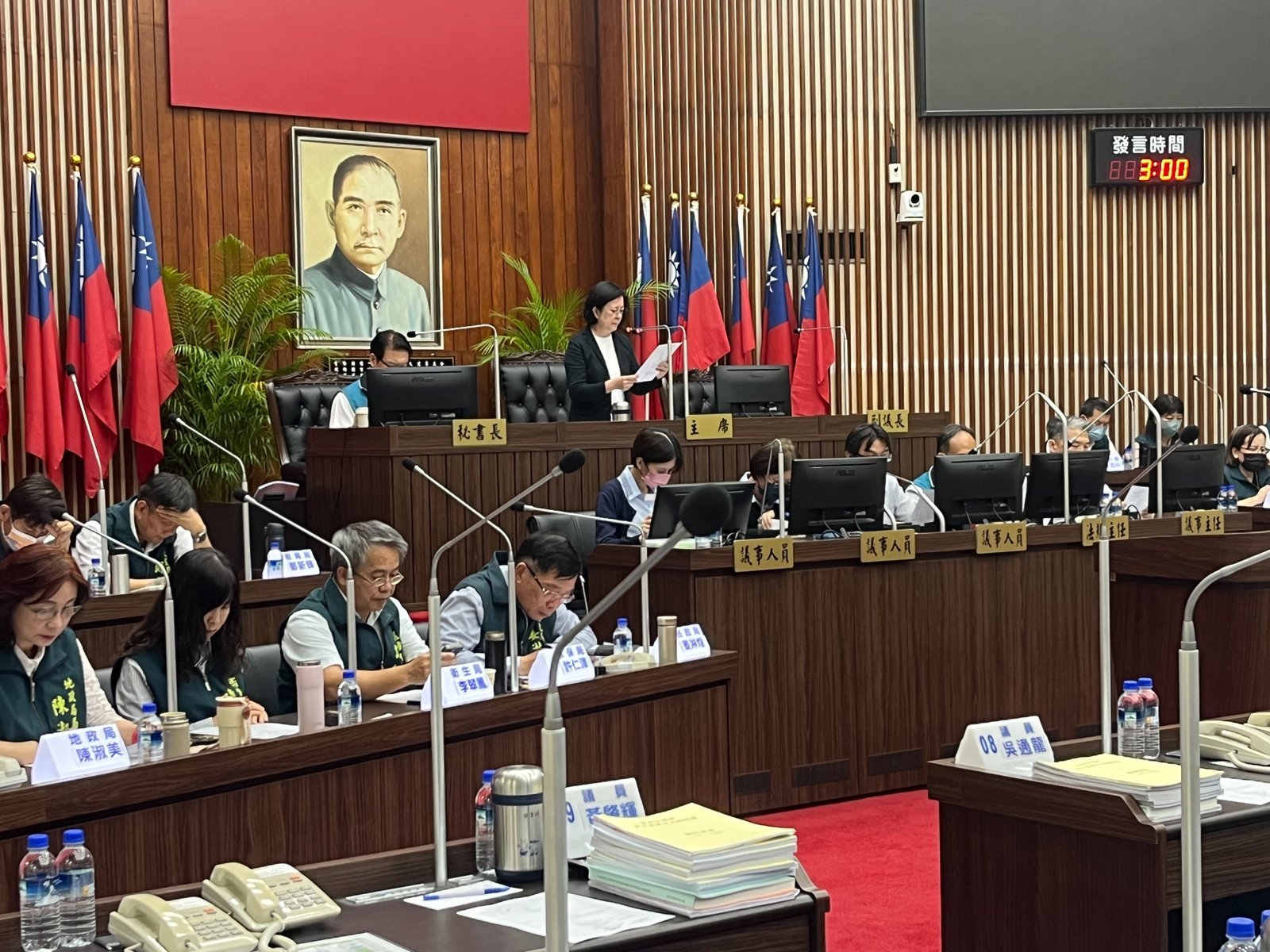 邱莉莉議長表示,依據內政部對地制法的相關函示,若因颱風等不可抗力因素無法召開會議,會期可依法順延,確保議事順利推進。經與會人員討論協商,確定議程變更方案:8 月 14 日上午大會結束後,財經委員會隨即於民治 1 樓會議室審查議案,下午 2 點則由環保衛生委員會接續審查;保安、建設及民政教育委員會的議案審查安排在 8 月 15 日上午,地點為永華會場。