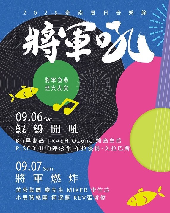 【透傳媒記者杜忠聰/臺南報導】邁入第 14 年的「2025 臺南夏日音樂節 – 將軍吼」,已成南臺灣指標性音樂盛事。今年 9 月 6 日至 7 日,13 組實力與人氣兼具的藝人將齊聚將軍漁港,其中 9 月 6 日為偶像之夜「鯤鯓開吼」,9 月 7 日以樂團之夜「將軍燃炸」壓軸,與粉絲共赴音樂盛宴。