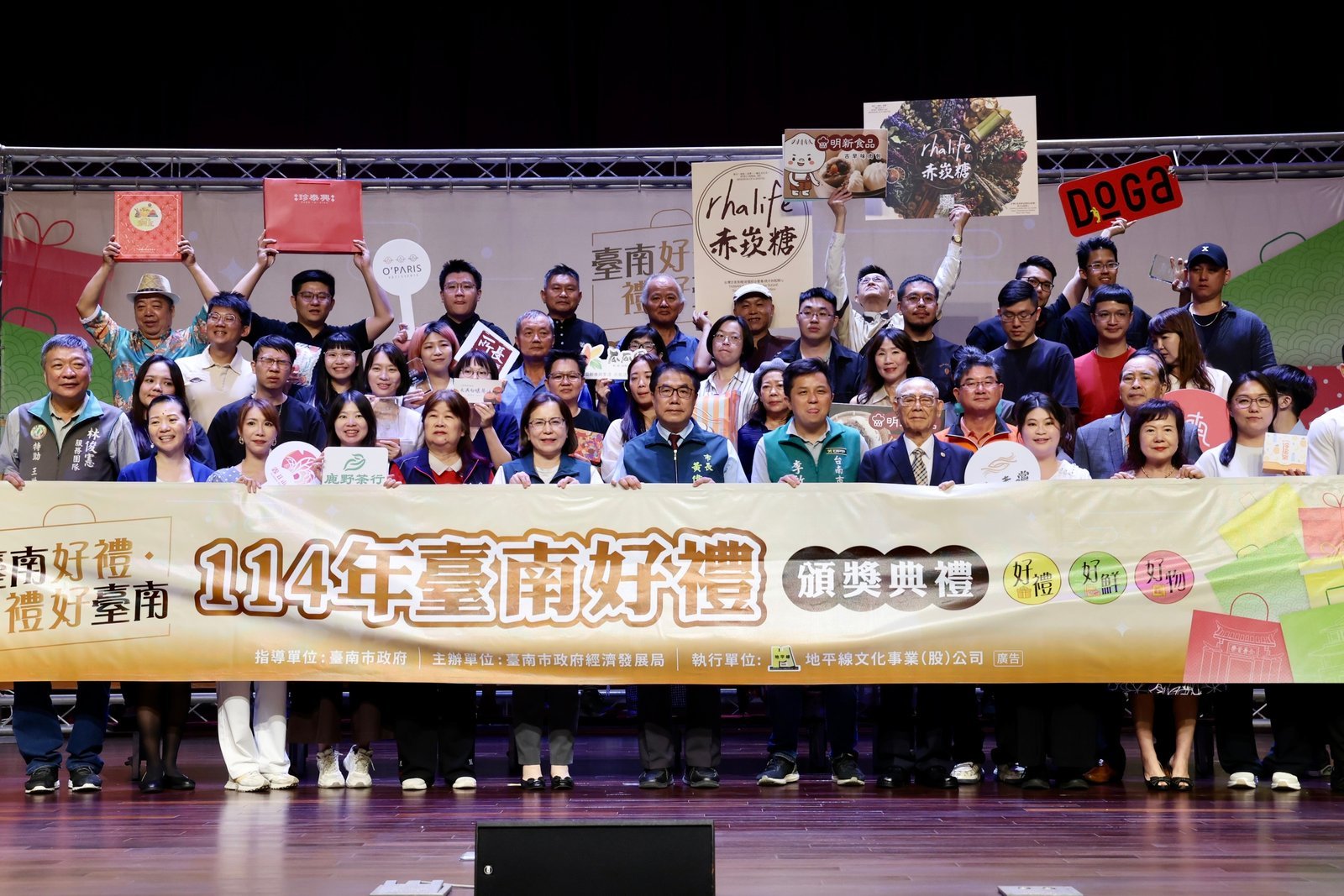 【透傳媒記者杜忠聰/臺南報導】台南市政府為推廣在地優質商品與特色產業,舉辦「114 年台南好禮徵選活動」,28日下午在虹韻文創中心演藝廳舉行頒獎典禮,市長黃偉哲親自頒獎表揚業者,市議員李啓維及立委林俊憲辦公室代表也到場祝賀。