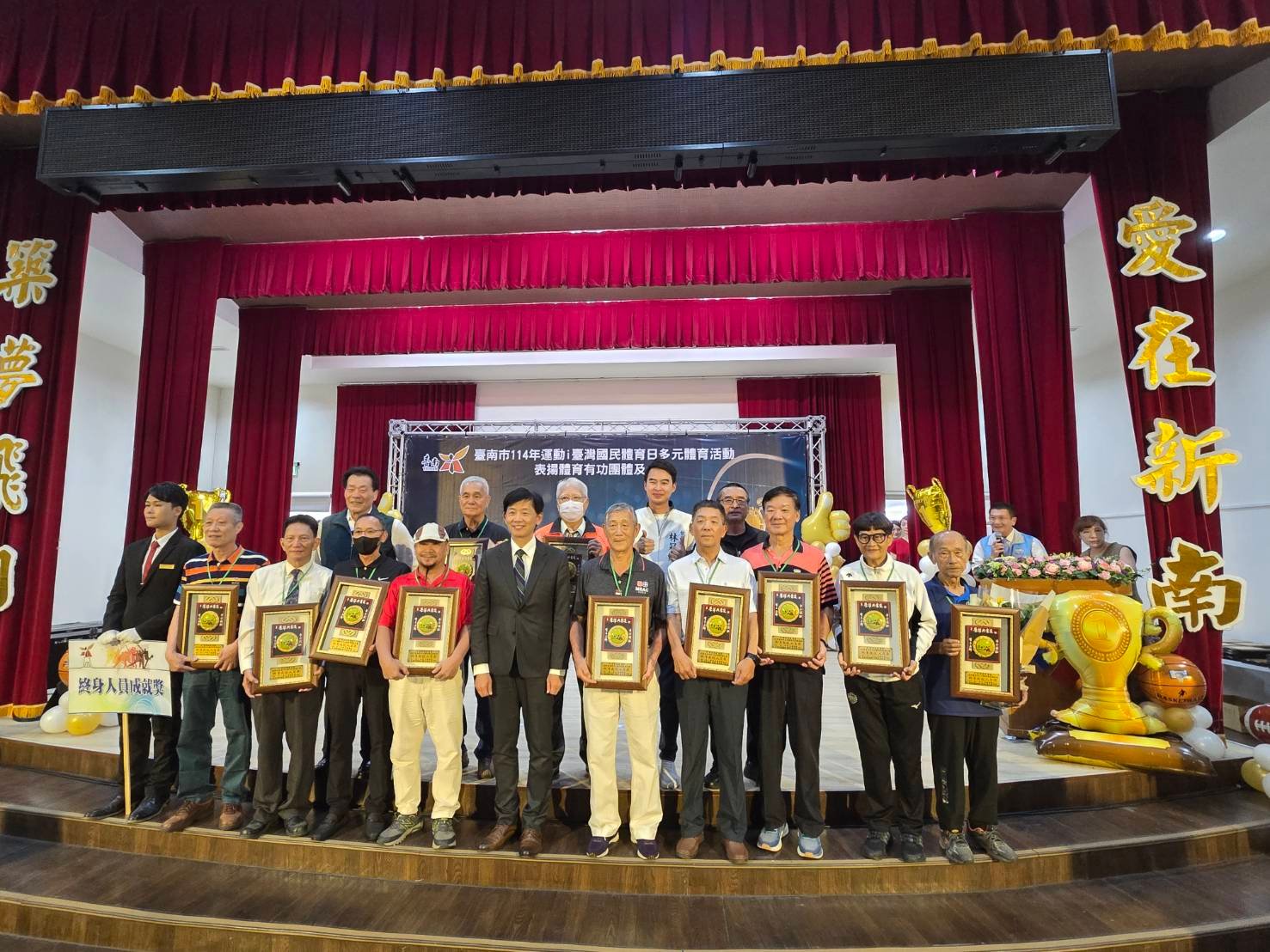 體育局局長陳良乾表示,大會旨在鼓勵支持推展臺南體育的有功者,今年共設 9 個獎項,186 名獲獎人員及 5 個得獎單位。其中,終身成就獎 11 人,81 歲的黃義揚連續 20 多年擔任田徑、馬拉松賽事裁判,還在競技賽事獲佳績;菁英獎 21 人成績亮眼,王建民、高志綱教練帶領選手奪 WBSC 世界棒球 12 強賽冠軍,陳忞昕在 2025 世界青少年桌球錦標賽得 1 金 1 銀 2 銅等。