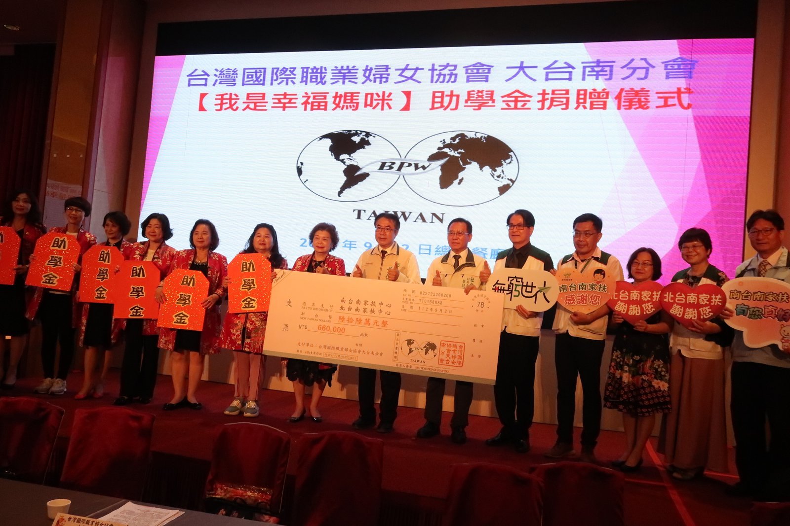 台灣國際職業婦女協會(簡稱BPW)郭壽珍總會長及BPW大台南分會現任會長陳秋麗同時表示:近三年的疫情,讓家扶有六成以上的扶助家庭因疫情導致收入減少,微薄收入僅勉強應付基本生活開銷,所以2022年在IFBPW92 週年慶時,全國同步舉辦『BPW 疫起助兒童 向前走』活動,資助727位學童助學;今年疫情趨緩生活化,大台南分會更主動舉辦『我是幸福媽咪』社福捐贈活動;自活動發起後,很快獲該會會姐響應,藉由會姐的力量,在新學期開學,即發揮扶幼助貧精神,並以愛人之心及能量、用「媽咪溫暖的心守護孩子」的起心動念,希望以此為弱勢孩子帶來幸福與希望,也讓BPW的姐妹在重視孩子的需要當中,發揮了更多愛的契機。台南市商業總會宋俊明理事長及善心人士陳寶春女士得知BPW此次愛的行動,也熱情響應並支持挹注助學金。