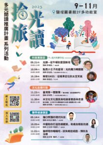 鹽埕圖書館向以「科普」為館藏特色,今年透過系列活動擴展閱讀推廣深度與廣度。9 月至 10 月的「科普實驗室」,由成功大學科教中心師資團隊設計 3 場課程:「光跡 — 從牛頓到愛因斯坦」以實作帶領認識光的特性;「點亮小王子的星球:光的魔力轉圈圈」從生活光現象培養科學探究能力;「解密 GNSS:從精準定位到太空天氣」解說福衛七號的作用,讓科學學習貼近生活。
