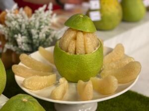 台南麻豆文旦向以果皮薄、果肉細緻、甜度高且帶微酸的絕佳風味圈粉。麻豆獨特的黏質土壤與充足日照,使其成為臺灣文旦重要產區。文旦採收後需經數日「辭水」熟成,過程中多餘水分蒸發,表皮從青綠光滑轉為黃綠皺軟,辭水一周以上更能凸顯風味層次與香氣,是中秋應景佳品。