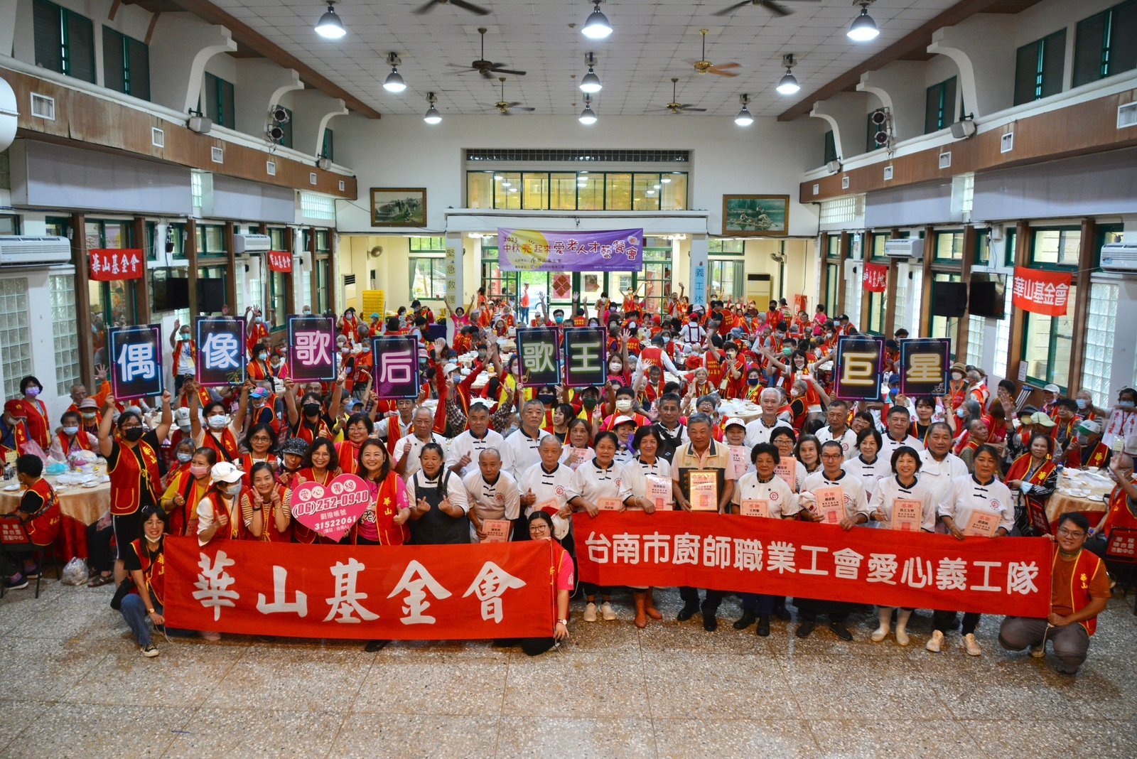 台南市廚師職業工會第四年響應「愛老人K歌愛心餐會」,以實際行動支持在地老人服務,除支持全數桌菜費用外,並號召多位義廚加入,以台灣傳統的「辦桌」形式,讓長輩們享受美食佳餚,長輩連同義工將近400人,一同感受熱鬧溫暖的人情味。幼芽幼兒園小朋友、阿寶魔術師及省躬國小戰鼓秀帶來精彩的表演,活絡現場氣氛,工會林水松監召、市府代表、林美燕市議員及盧崑福市議員等多位議員代表來賓,著懷舊裝扮進行上菜秀,最令人引頸期盼的是長輩們站上五光十色的舞台高歌,長輩與義工除了一起高歌合唱,現場氣氛也相當歡樂。華山中秋活動讓長輩拉近與社會的距離、持正能量生活,陪伴長者優雅變老,並呼籲民眾響應關懷,周全在地服務網絡。
