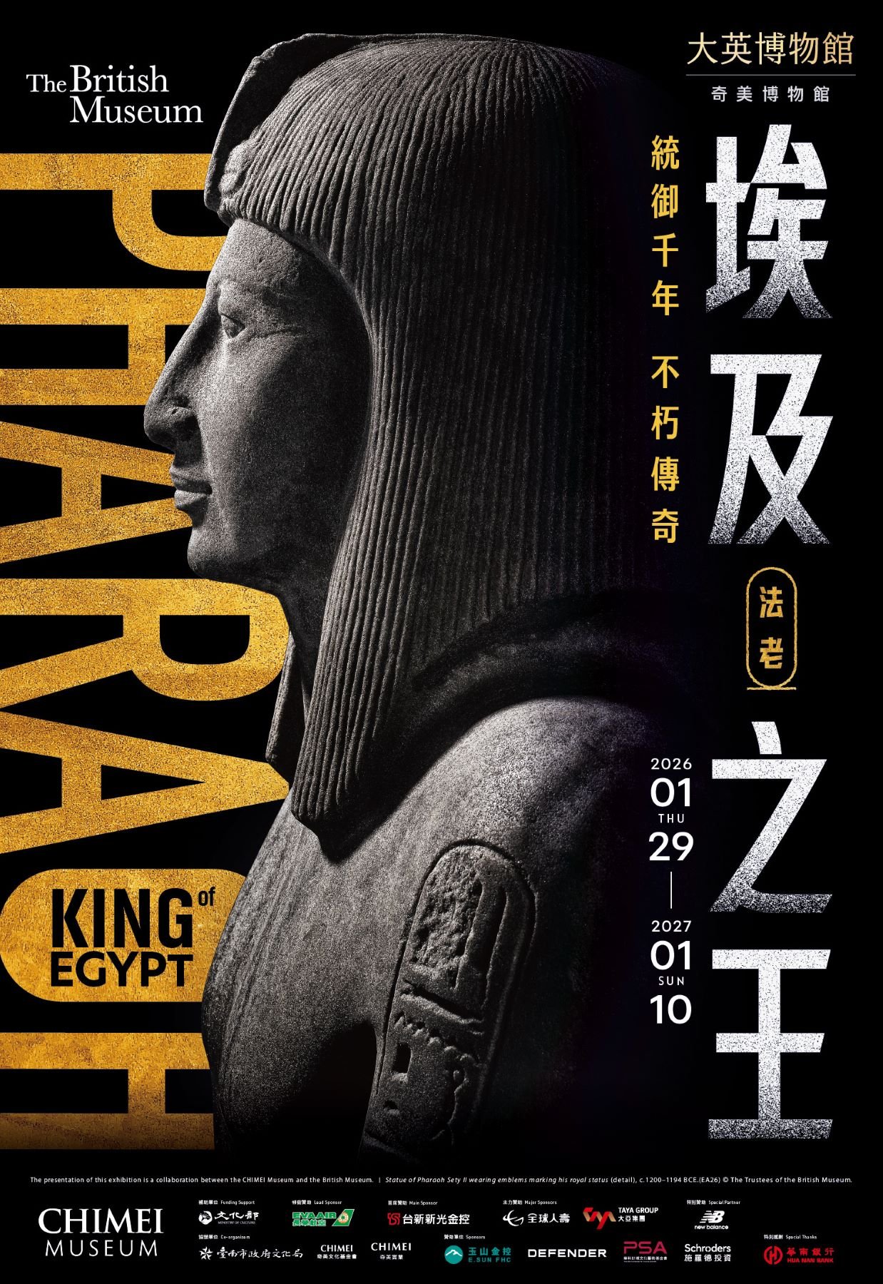 【透傳媒記者廖蓓慈/臺南報導】一場前所未有的古埃及盛會,即將沸騰臺南!奇美博物館繼去年《從拉斐爾到梵谷》大展轟動全台後,今天再度發布重磅消息──2026年將與大英博物館合作推出超級大展《埃及之王:法老》,集結280件稀珍藏品,從黃金珠寶、陪葬珍品、神廟建築到巨型石雕,不但是台灣史上最大規模的法老文物,更十分罕見地引進總計達28噸的大型石像,磅礡呈現古埃及帝國的宏偉氣勢。民眾將透過拉美西斯二世、圖坦卡門等56位帝王統治期間的文物,穿越時空感受法老統御千年的不朽傳奇。早鳥票將於10月20日開賣。