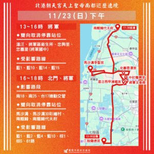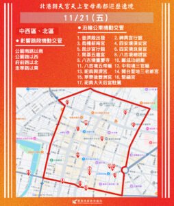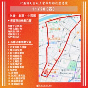 【透傳媒記者杜忠聰/臺南報導】「2025 乙巳年北港朝天宮天上聖母南都巡歷」活動遶境路線將於 20 日(週四)進入台南市區,北區、中西區、安平區交通恐受顯著影響。台南市交通局發出預警,籲市民提早規劃替代路線,避開擁擠路段。