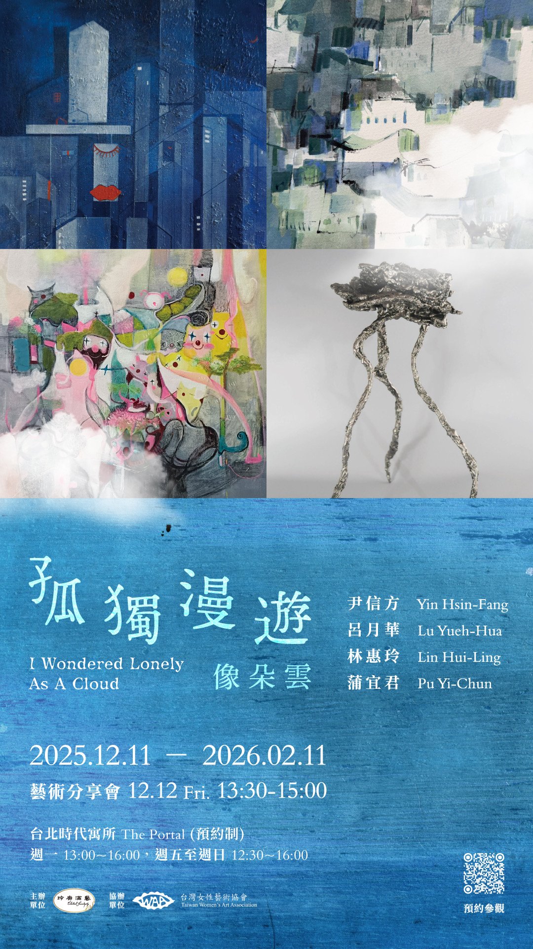 本展為玲廊滿藝與台灣女性藝術協會共同推動女性藝術的年度策劃。以詩為線索、以心靈為座標,凝視女性創作者於時代轉折與生命經驗中的感性迴響。。誠摯邀請您走進《孤獨漫遊》的藝術場域,於城市的節奏中暫停片刻,與作品一同感受孤獨的詩意與自我對話的溫度。