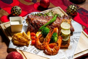 BBQ豬肋排,慢火烘烤外層焦脆、內裡軟嫩,是冬季餐桌上最能凝聚幸福感的主角之一。義式香草鮭魚,以香草、檸檬與奶油增添香氣,與鮭魚油脂平衡得剛剛好,成為整桌料理的亮點。炭烤海大蝦,高溫炭烤逼出蝦肉的鮮甜與香氣,海味與炭香交織,更添餐桌上的美味。