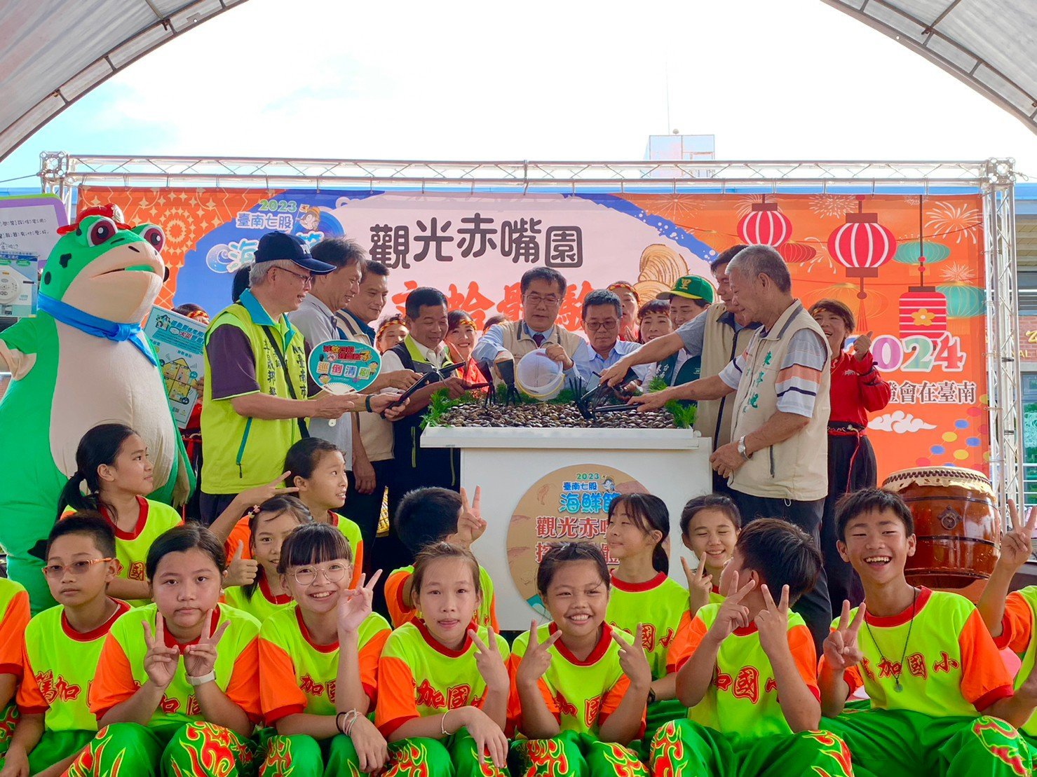 【透傳媒記者杜忠聰/臺南報導】由臺南市政府觀光旅遊局與七股區公所共同辦理的「2023臺南七股海鮮節-觀光赤嘴園挖文蛤體驗活動」9月16日在七股六孔碼頭開幕,開場由七股區篤加國小帶來精彩的擊鼓表演,由臺南市長黃偉哲、副市長葉澤山、農業部漁業署副署長陳建佑、台江國家公園管理處副處長許嘉祥、雲嘉南濱海國家風景區管理處秘書吳宗青、經濟部水利署第六河川局正工程司陳俠儒、觀光旅遊局林國華局長、新聞及國際關係處蘇恩恩處長、七股區公所李佳隆區長、警察局佳里分局蘇政敏分局長,蔡蘇秋金議員、方一峰議員、謝舒凡議員及各立委、議員服務處,以及地方社區、協會業者代表等貴賓共同參與開幕活動。配合今天潮汐,下午4點開放民眾下水體驗,現場超過3,000人一起在六孔碼頭潟湖挖文蛤同樂。