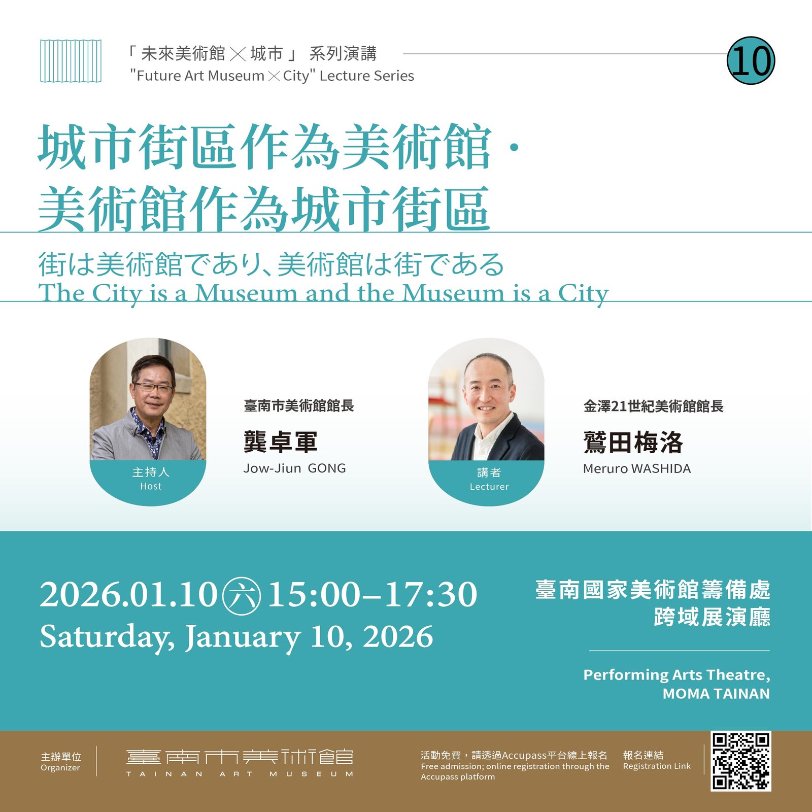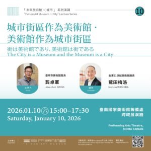 同日 15:00-17:30,「未來美術館 X 城市」系列講座第十場登場,日本金澤 21 世紀美術館館長鷲田梅洛蒞臨分享,龔卓軍館長主持。講座以「城市街區作為美術館・美術館作為城市街區」為題,分享金澤 21 世紀美術館推動社群藝術與城市型策展的經驗,探討美術館如何走出建築本體,與城市日常生活緊密連結,為雙年展帶來重要國際對話。此外,18:30(18:20 入場)將舉行「南美館 X 開放策展學校 文化交陪境結盟儀式」,地點均為臺南國家美術館籌備處跨域展演廳。