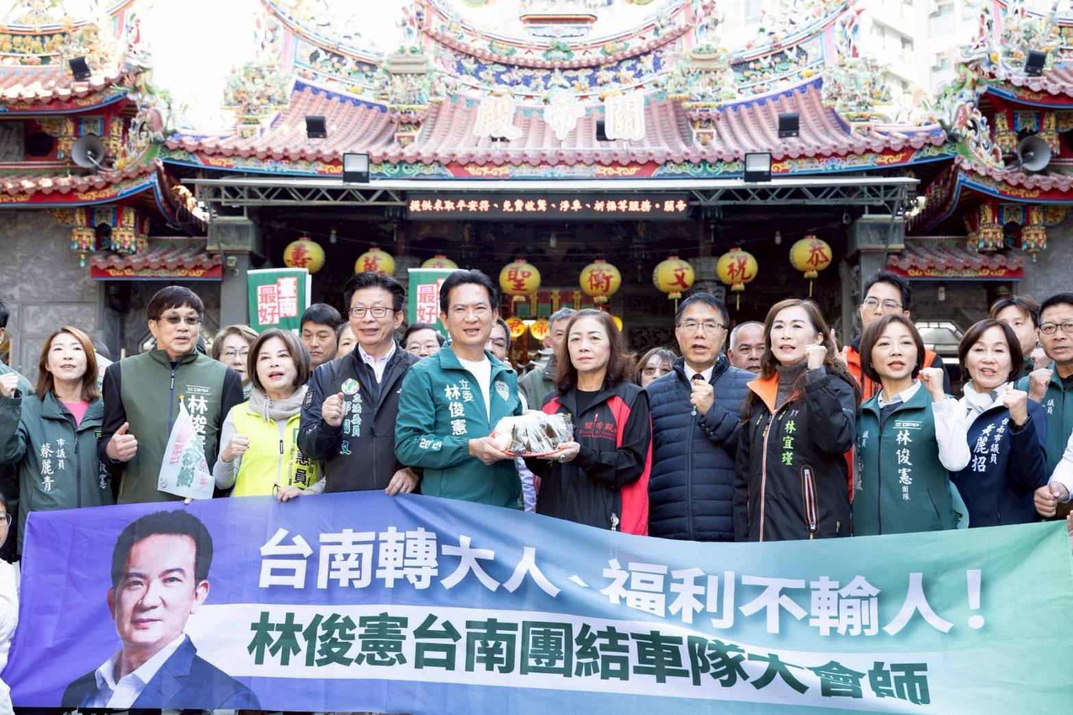 在車隊大會師現場,關帝殿許主委與幹部送上包子與粽子,象徵祝福與力挺。林俊憲並與副議長林志展團隊及多位市議員,在縣市合併即將屆滿 16 年之際,以台南「做十六歲」的傳統儀式,高喊「台南轉大人、福利不輸人」,宣示推動六都首創的長輩免費接種帶狀皰疹疫苗、學童營養午餐牛乳再升級等政見,朝六都社福第一城市邁進。