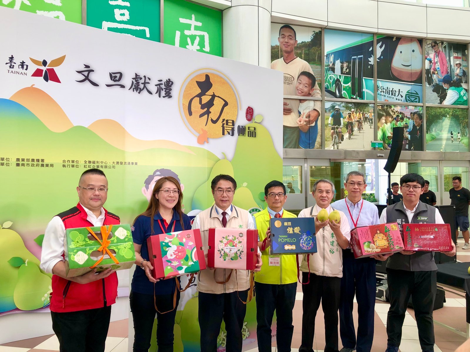 【透傳媒記者杜忠聰/臺南報導】臺南市政府與全臺超過1,100家全聯福利中心及大潤發攜手合作,讓消費者走路就買得到臺南文旦禮盒,20日臺南市長黃偉哲、農糧署副署長蘇茂祥、農糧署南區分署副分署長黃怡仁、臺南市政府農業局局長李建裕、臺南市政府新聞及國際關係處處長蘇恩恩、全聯福利中心南高處副處長梁又霽及大潤發佳里店店總經理童有賢等人於臺南市政府宣傳,消費者不用跑到產地,就近在日常生活圈中的全聯或大潤發就可以買到,送禮自用兩相宜,呼籲民眾把握時機品嘗臺南文旦。