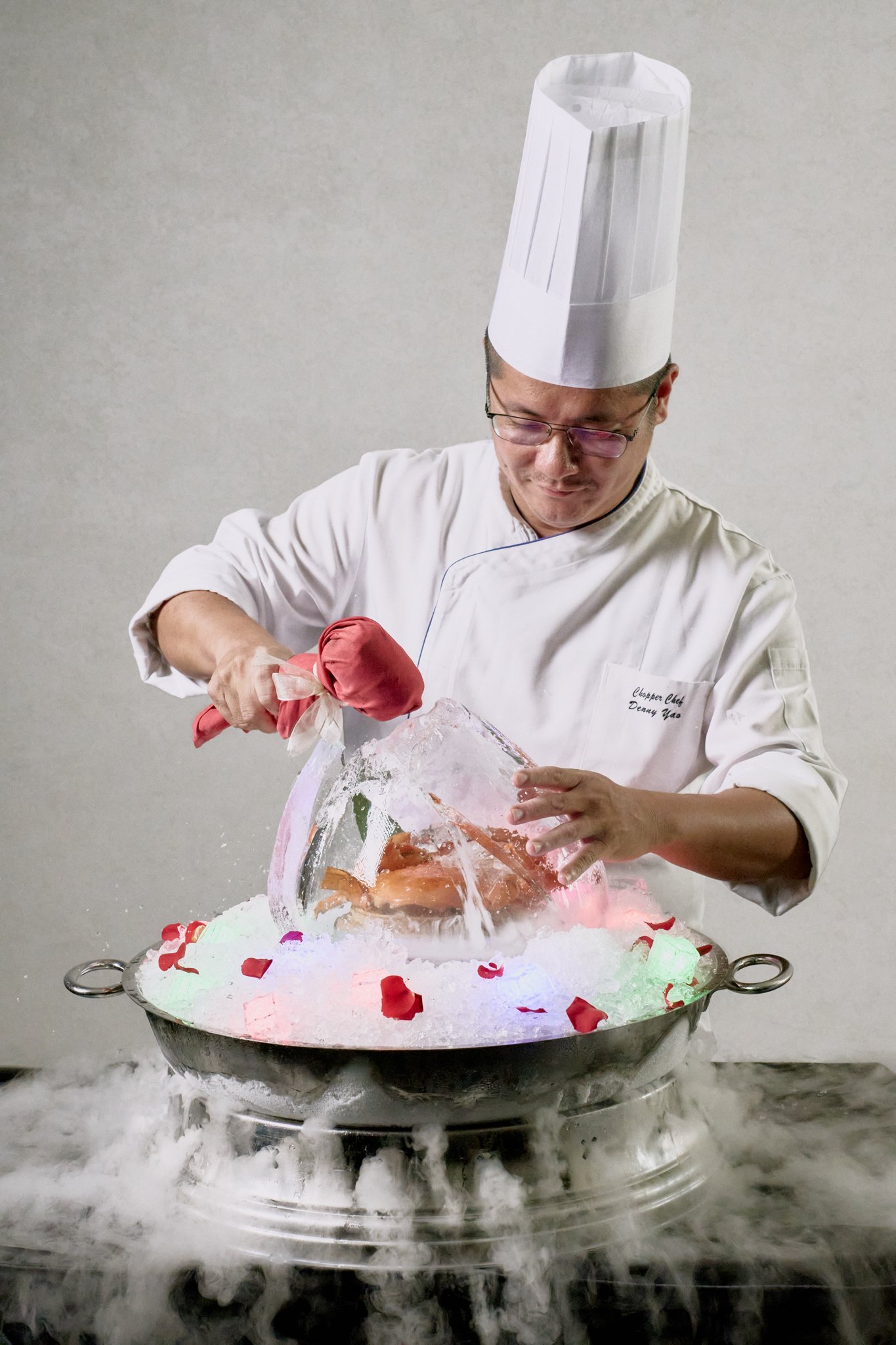 另款冰宮清酒浸活蟹,做工繁複需耗時三天,先將洗淨的螃蟹和薑、蔥、米酒下鍋蒸熟後,加以冰鎮鎖住其香料風味,依序添加清酒、枸杞、鹽、冰糖等食材醃製72小時入味,淡雅的酒香令人陶醉其中,然而此道菜餚呈盤特別吸睛,服務人員餐車推出後即感受到乾冰寒氣,巨型豪華冰宮映入眼簾,為提升用餐體驗,特別邀請賓客以槌子敲破冰宮取出蟹料理,有此一舉好比螃蟹宣誓將帶著究極誘人的美味衝破冰層,有趣的互動方式也讓饕客感受清鮮秀雅的驚艷滋味。