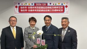 郡和子感謝黃偉哲應邀來訪,憶及去年11月訪台南獲熱情接待,印象深刻。她指出,20周年是交流重要里程碑,仙台車站同步舉辦台南宣傳活動,讓她倍感欣慰。郡和子並贈送20周年紀念達摩,象徵友誼長存,盼未來拓展更多領域交流。