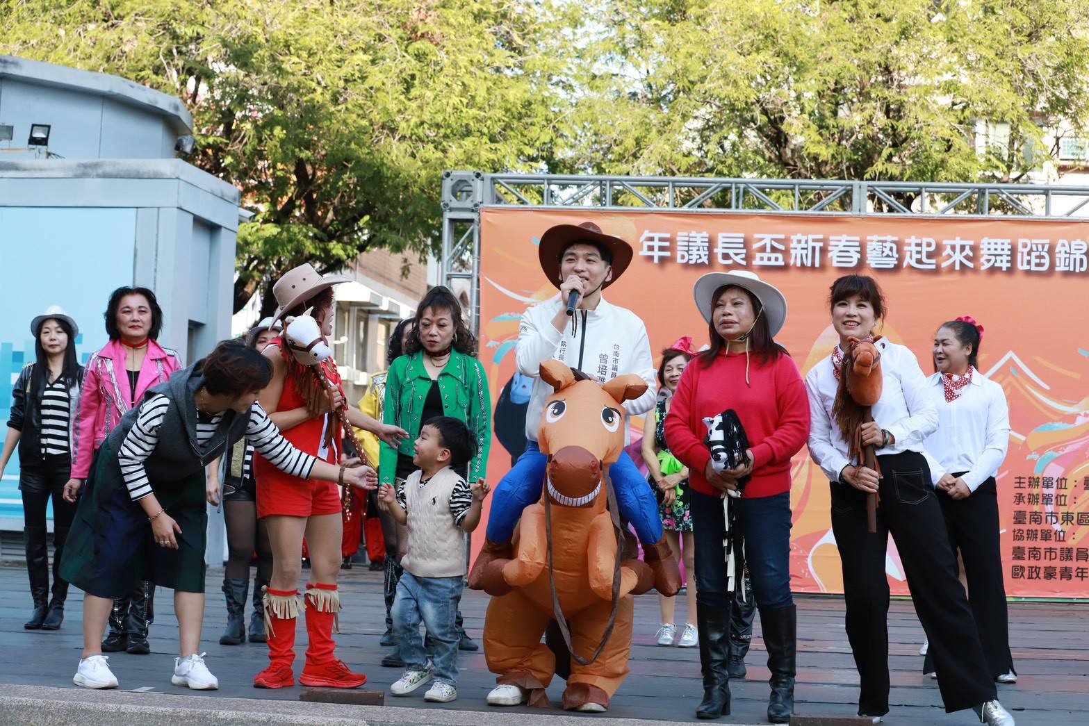 東區市議員參選人歐政豪穿小馬充氣裝登台互動,加碼舞步逗樂民眾,將氣氛推向高點,隨後與全场合照,洋溢「馬年行大運」喜氣。他表示,感動於舞者與家庭的投入,以「馬到成功」祝福新年,象徵接棒延續曾培雅的服務精神,讓臺南幸福發光。