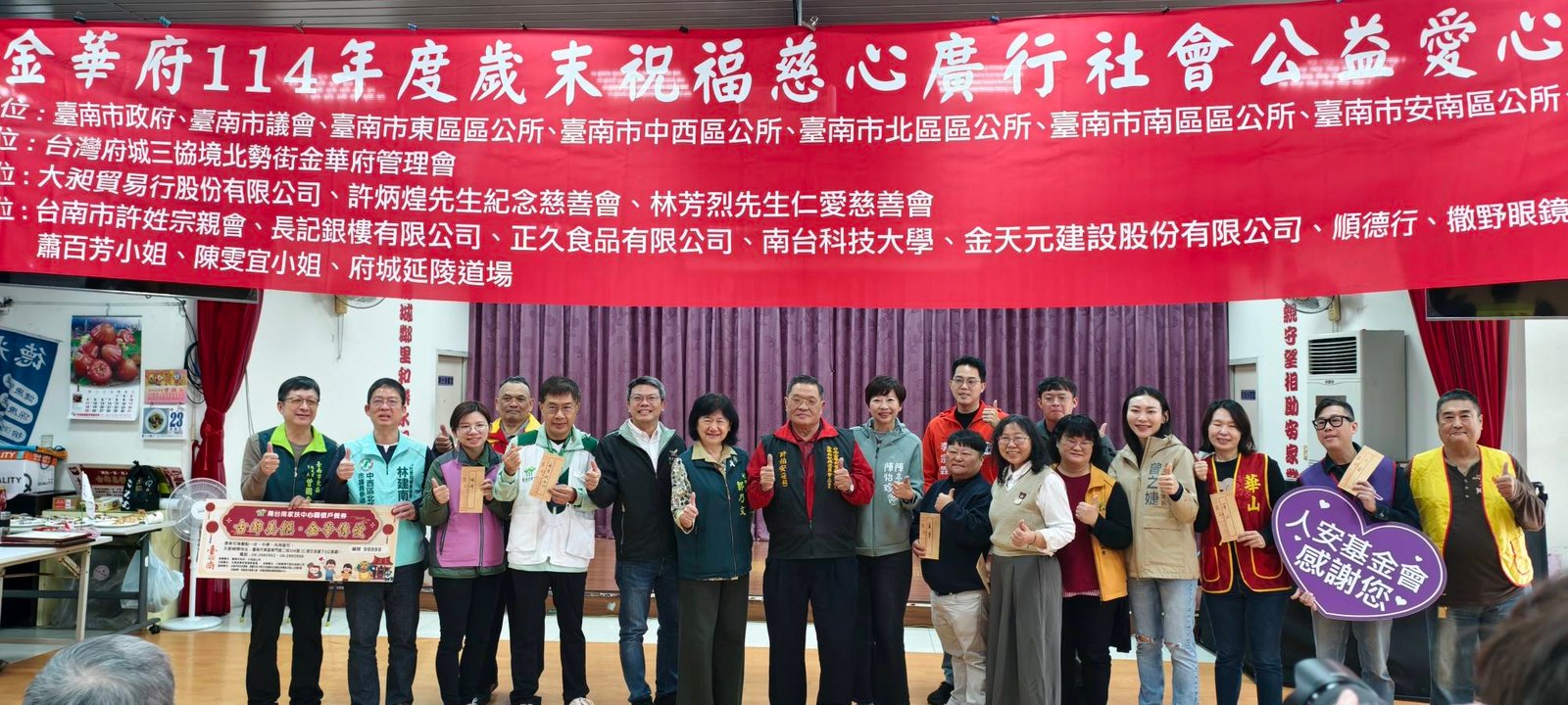 金華府亦捐贈南台南家扶中心等8個社福團體共16萬元,支持第一線服務;另致贈代煮愛心餐團隊4萬3600元,肯定其無私奉獻。活動獲台南市政府、議會及各區公所指導支持,由金華府管理會主辦,多家企業、團體及個人協辦,公私協力匯聚善心。