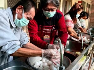 製作招牌鳳梨蛋的前置作業,是這場年節盛事的重要序幕。在水槽前,工作人員與服務對象戴著手套與口罩,正仔細地清洗潔白的雞蛋。