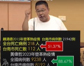 透傳媒記者杜忠聰/臺南報導】台南市登革熱病例占全國九成,議會特別進行『登革熱防治專案報告』,國民黨團指出,近來接陳情電話接到手軟,市民對市府拼命室內噴藥的做法非常不滿,市府宣導人工智慧AI可有效防治登革熱,推行多年疫情又噴發,成效何在?若當初發生第一例境外移入病例,在法定的48小時內就噴藥,也不至於讓疫情失控,市民更氣憤中央大員南下幾天就說疫情已控制,如此邀功置辛苦的第一線基層人員尤其是年輕化學兵於何地?