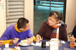 為協助小儒,小作所結合職能治療師等外部專業團隊,擬定個別化服務計畫;教保老師更花三年學習手語、請益聾人老師,貼近其溝通方式。據點另成立手語社團,邀小儒擔任助教帶領學員學習。此次圍爐中,小儒不僅贴心為媽媽夾菜,更能以手語與身旁學員自在互動,笑容裡滿是成長的感動。