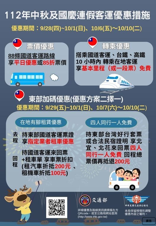 交通部公路局為鼓勵民眾於連假期間多加搭乘公共運輸,本次中秋及國慶連假優惠措施如下: