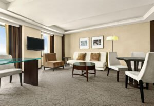 本次推出兩大重磅住房專案,首推「周年慶奢華禮遇・升等套房」,每房每晚 5,820 元起,預訂豪華閣尊榮客房加價 17 元,即可升等至一房一廳的雅仕套房,擁有獨立客廳與臥室的寬敞空間。同時尊享豪華閣貴賓廊完整禮遇,含專人辦理住退房、全日飲品、翌日早餐及傍晚雞尾酒與小點等服務。