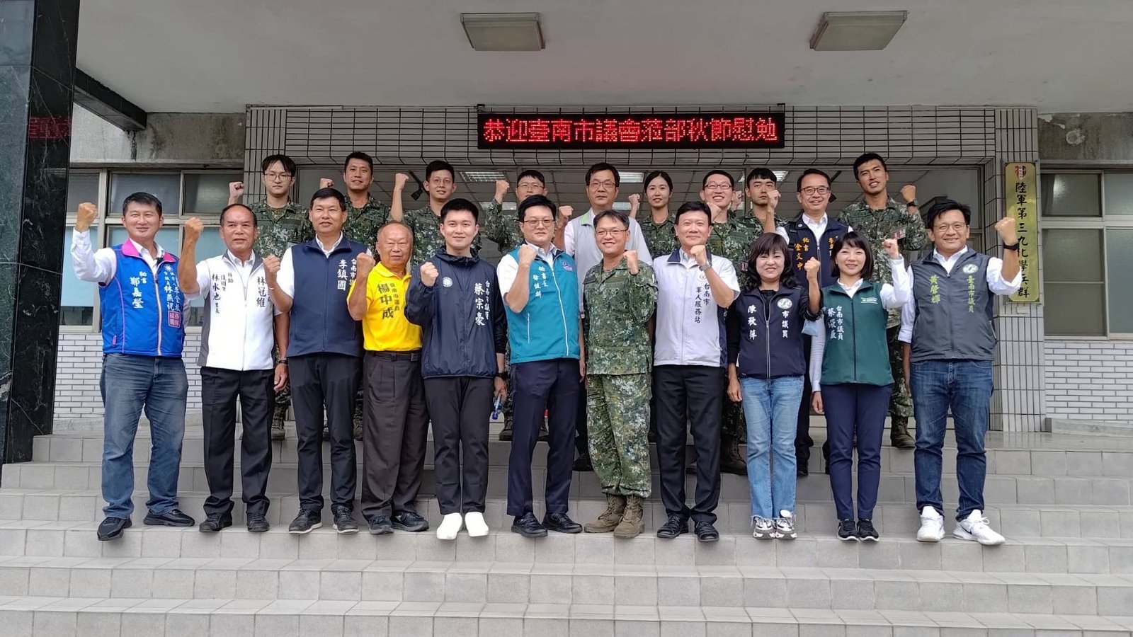 台南憲兵隊、陸軍第八軍團三九化學兵群、陸軍砲兵訓練指揮部及陸軍第八軍團第二○三旅分別由副隊長陳紹銘中校、指揮官羅斯鴻上校、指揮官何建順少將及旅長蘇茂賢上校代表接待。東區區長顏能通、永康區區長陳勝楠、官田區區長黃炳元、臺南市軍人服務站站長劉可雲與專員鄭擇宗亦陪同議會勞軍慰問。