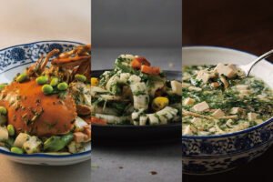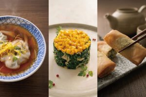 主菜方面,「薺菜年糕燒膏蟹」用上海本幫燒法,慢火收汁使蟹膏醬香與年糕融合,薺菜清香平衡濃度;「薺菜炒目魚鮮筍」高溫快炒,呈現花枝、春筍與薺菜口感香氣對比。湯品「竹笙薺菜豆腐羹」延續江南清羹路線,點心「薺菜蝦仁包餛飩」與「薺菜鮮肉炸春捲」呼應江浙「咬春」文化。