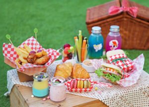 野餐籃以《飛天小女警》主角代表色為靈感,餐點方便手持、好分享且不易沾手。甜點清爽不甜膩,主食美味又有飽足感,搭配炸物拼盤、水果沙拉杯和角色特調飲品,玻璃杯盛裝既吸睛又落實永續。