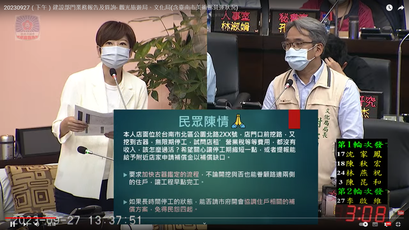 陳怡珍表示,下水道工程就位於店家及住戶的正門口,現在因為無限期停工損失慘重,不只出入不便、交通壅塞、生意慘淡,連上次9月初大雨都造成比以往更嚴重的積水,地方怨聲連連。陳怡珍要求文化局務必隨時與水利局保持暢通聯繫,兼顧文資保存與施工進度,加速進行相關行政程序,千萬不要讓工程一直延宕,將對民眾的影響降到最低。