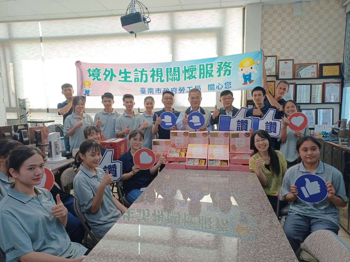【透傳媒記者杜忠聰/臺南報導】隨著新南向政策推動,愈來愈多境外生來到臺南,適逢中秋佳節,黃市長偉哲也持續關心這群異鄉學子,指示勞工局於佳節與其分享本土風情,同時給予生活關懷。今日(9/27)勞工局協同崑山科技大學前往冠亞豐科技有限公司,訪視於該公司工讀之新南向國際專班境外生及畢業留臺工作之白領移工,關懷其求學及工作的情形並致贈中秋月餅。