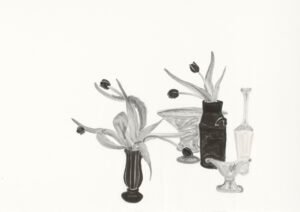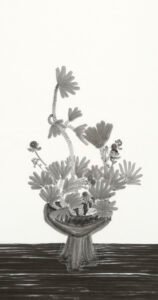 作品引領觀者進入「蝴蝶複眼」視角,如〈一雙貝母〉墨色花蕊水潤,〈向光斜倚的鬱金〉捕捉葉片姿態,〈貓與一室植物〉凝固生活動靜瞬間。展場巧用空花器與留白。