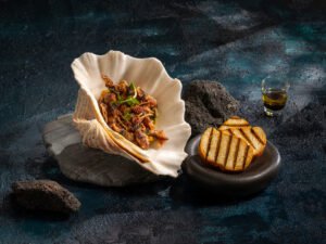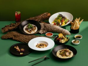 「山釀極鮮」餐點選用宜蘭山泉鱘龍魚與美國 SRF 極黑和牛,主菜紅酒燉 SRF 極黑和牛佐奶香薯泥,搭配炭烤雙菇與芝麻葉;湯品「地中海漁夫湯」加入在地手工魚冊與炙燒鱘龍魚玫瑰卷;甜點與台南老字號合作,展現台式與西式融合。