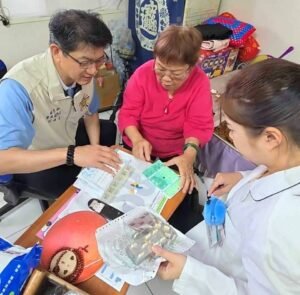 抵達長者住家後,張個管師細心為長輩進行健康評估,了解慢性病控制情形、用藥狀況及日常生活能力,並透過數位醫療系統協助建立健康管理資料,提供後續追蹤與醫療諮詢建議。訪視過程中,張個管師展現醫療專業,運用長者整合性照護指引(ICOPE),檢測「認知、行動、營養、聽力、視力及憂鬱」六大面向,早期發現功能問題,介入運動與營養等處置,鼓勵長者們每日執行6式坐姿訓練,維持肌力與身體機能。服務團隊也耐心與長者聊天,關心生活起居,提醒按時服藥與注意身體狀況。許多長者因子女不在身邊,加上交通不便,就醫常需長途跋涉,如今透過榮服處與醫療院所合作的個案管理與數位健康服務,讓醫療照護得以延伸至偏鄉,減少長者奔波之苦。