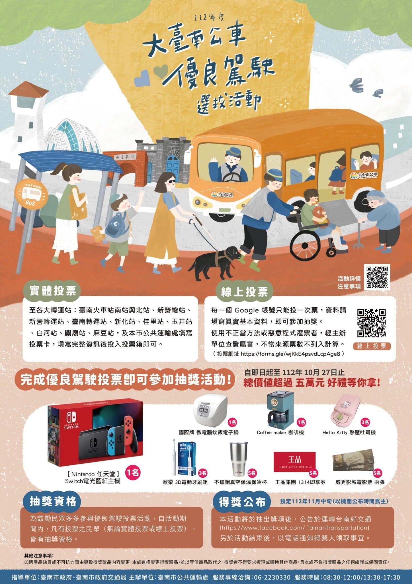 凡成功參加票選並留下完整資料者皆可參加抽獎,將有機會獲得Nintendo任天堂Switch電光藍紅主機、微電腦炊飯電子鍋、咖啡機、Hello Kitty熱壓吐司機、歐樂3D電動牙刷組、不鏽鋼真空保溫杯、王品集團1314即享券或電影票等多項獎品。相關活動詳情與抽獎結果將公告於交通局「運轉台南好交通」臉書專頁(https://www.facebook.com/TainanTransportation),請各位市民朋友們,千萬不要錯過喔!