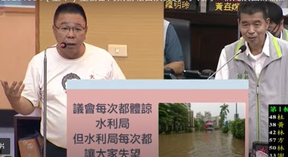 蔡育輝說,議會每次都體諒水利局,讓大家提早離席回去治水,但水利局,每次都讓大家失望,這些年來花了數百億元的經費治水,結果成效何在?會淹水的地區還是會淹水,比如永康和安南區這些地方,連賴清德自豪的,說只花三年就成功整治三爺宮溪三十年治不了的水患,結果也破功,原因何在?詢問水利局,局長又推給強降雨,如果治水這麼容易他也能當水利局長,因此,黨團堅持提高十年防洪標準,由24小時250毫米標準提高到500毫米,來面對全球極端氣候帶來的災情。