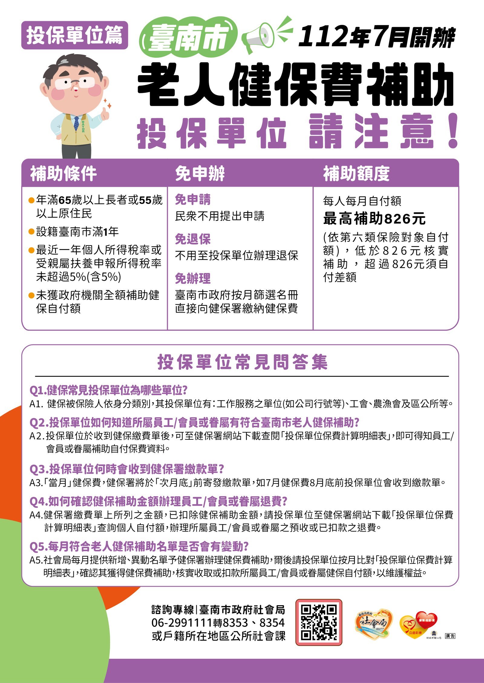 「老人健保補助」:為確保設籍本市長者獲得醫療健保服務、減輕長者及子女經濟負擔,臺南市自今(112)年7月起開辦補助老人健保費自付額。凡年滿65歲以上老人或55歲以上原住民、設籍本市滿1年,最近1年個人綜合所得稅率或受親屬扶養申報所得稅率未超過5%(含5%),且未獲政府機關全額補助健保自付額者,每人每月最高補助826元。全市計有27萬4,904位長者受益,社會局也印製宣導單張函發各投保單位加強宣導,並秉持照顧弱勢優先之精神,持續評估整體財政狀況,研議增加預算編列的可行性。