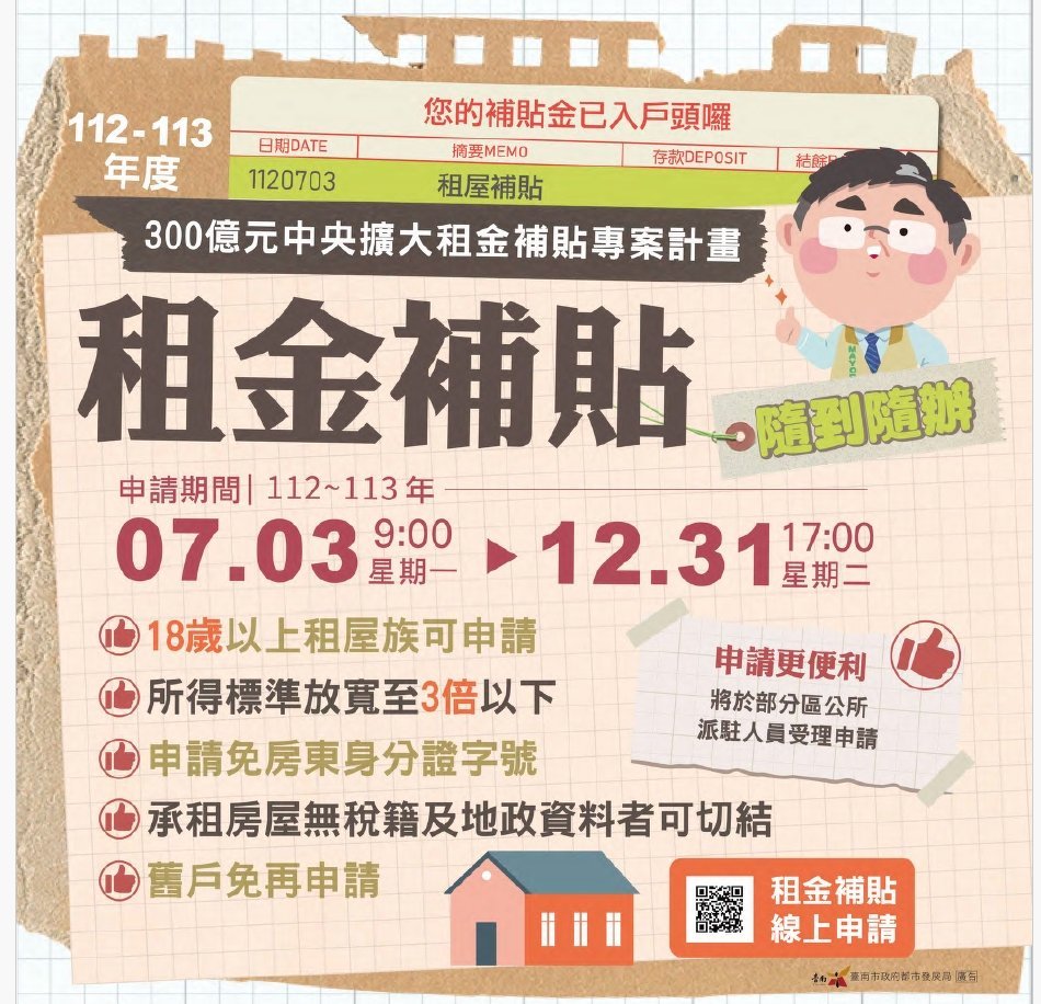 【透傳媒記者杜忠聰/臺南報導】為減輕租屋家庭負擔,營造安心成家的環境,行政院去年首推「300億元中央擴大租金補貼專案」,今(112)年7月3日起再次開辦本專案租金補貼,並配合民法成年之年齡下修為18歲,讓租金補貼照顧對象向下延伸,民眾只要是年滿18歲在外就學、就業的年輕租屋族群,皆可提出申請,實質擴大照顧範圍。