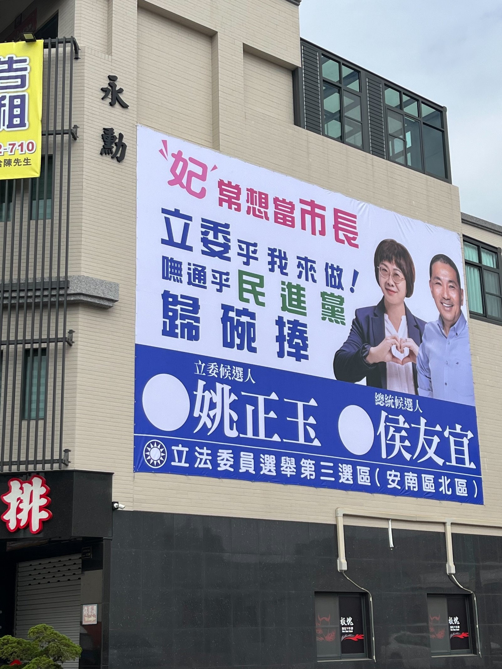 【透傳媒記者杜忠聰/臺南報導】國民黨台南市立委第三選區(安南區北區)立委候選人姚正玉,推出新一波的選舉看板,除了強調侯康配、和平拚經濟之外,直指對手「『妃』常想選市長,立委乎我來做,嘸通乎民進黨歸碗捧」。