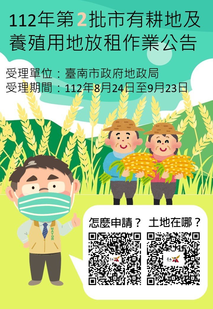 地政局長陳淑美表示,放租土地僅能作農業或養殖使用,並符合農業及土地使用管制等相關規定,歡迎有意承租者,且符合臺南市市有耕地及養殖用地出租辦法第15條規定之6類資格的民眾,可於公告期間內向地政局或土地所在地之區公所提出申請,相關放租資訊及規定可至臺南市政府地政局官方網站「公有耕地租約-最新消息」(網址:https://land.tainan.gov.tw/News.aspx?n=29792&sms=23409)查詢。