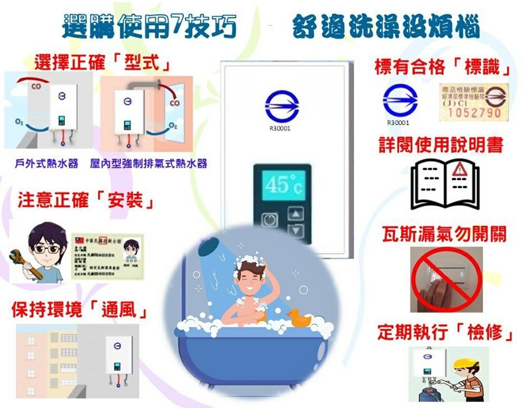 消費者在選購瓦斯熱水器時除了節能及價格考量外,應更加注意使用安全,經濟部標準檢驗局臺南分局提供7個選購及使用小技巧,讓您買的安心用的放心: