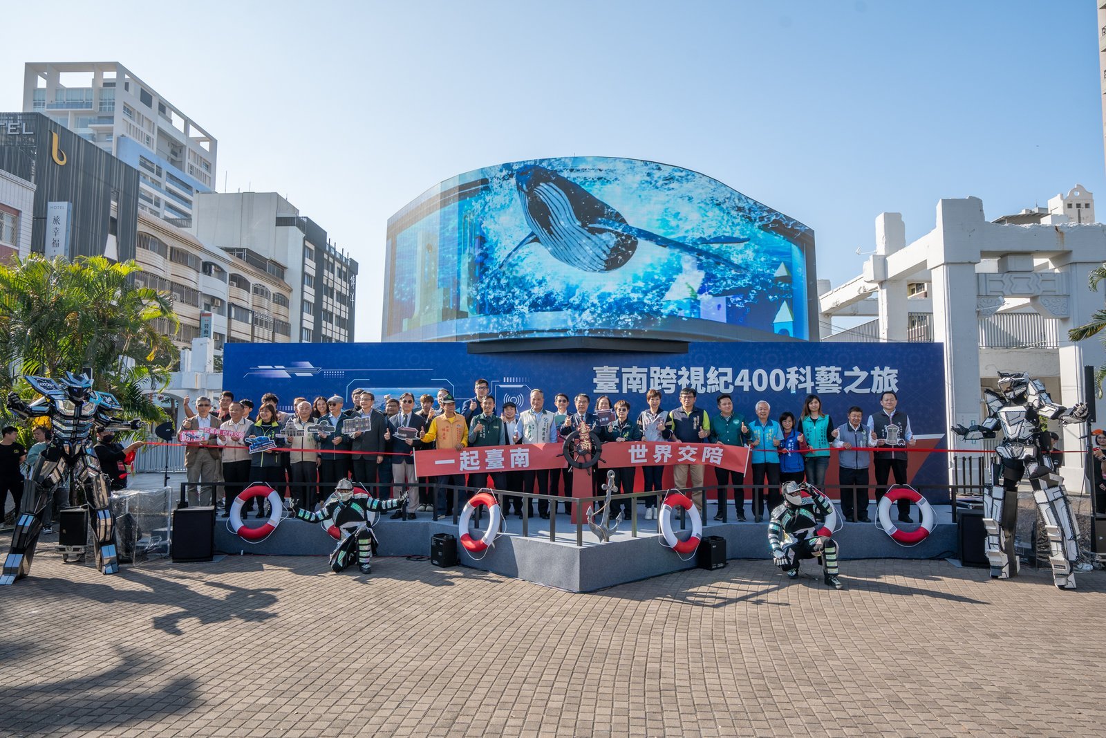 【透傳媒記者杜忠聰/臺南報導】以結合智慧科技及在地人文特色的奇幻視覺科技體驗為主軸的「臺南跨視紀400科藝之旅」,今(5)日在大型機器人鋼鐵軍團的特效演出中於河樂廣場揭開序幕,集結時下熱門的裸視3D、生成式AI、沉浸式體驗、AR擴增實境等科技,推出「裸視3D巨鯨遨遊」、「飛越時空AI沉浸式體驗」、「AI 角色扮演穿越秀」、「AR發現鯨奇」及「古都大富翁3D地景藝術」五大亮點,將河樂廣場營造為既魔幻、又寫實的闔樂共創廣場,即日起至2月4日共31天活動期間,帶您一同穿梭時空,看見過去,展望臺南未來。