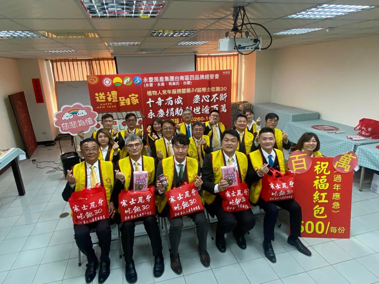 【透傳媒記者杜忠聰/臺南報導】時序入冬,各行各業開始為農曆新年做準備,「植物人常年服務暨第34屆寒士吃飽30尾牙」於2024年1月29日至2月7日,把13,250份祝福年禮及紅包,送至清寒植物人家庭、寒士、街友、獨居長輩、待拉單媽手中。為使活動順利舉辦,永慶慈善基金會今年再度率領旗下房產品牌台南區永慶不動產/永義房屋/有巢氏房屋/台慶不動產共同參與,捐助「祝福紅包」,由院民家屬代表受贈,今年(2024)因四品牌的加入共計募得30萬,十年來捐助總金額超過百萬,持續讓弱勢朋友們感受到來自社會大眾的溫暖與關懷。