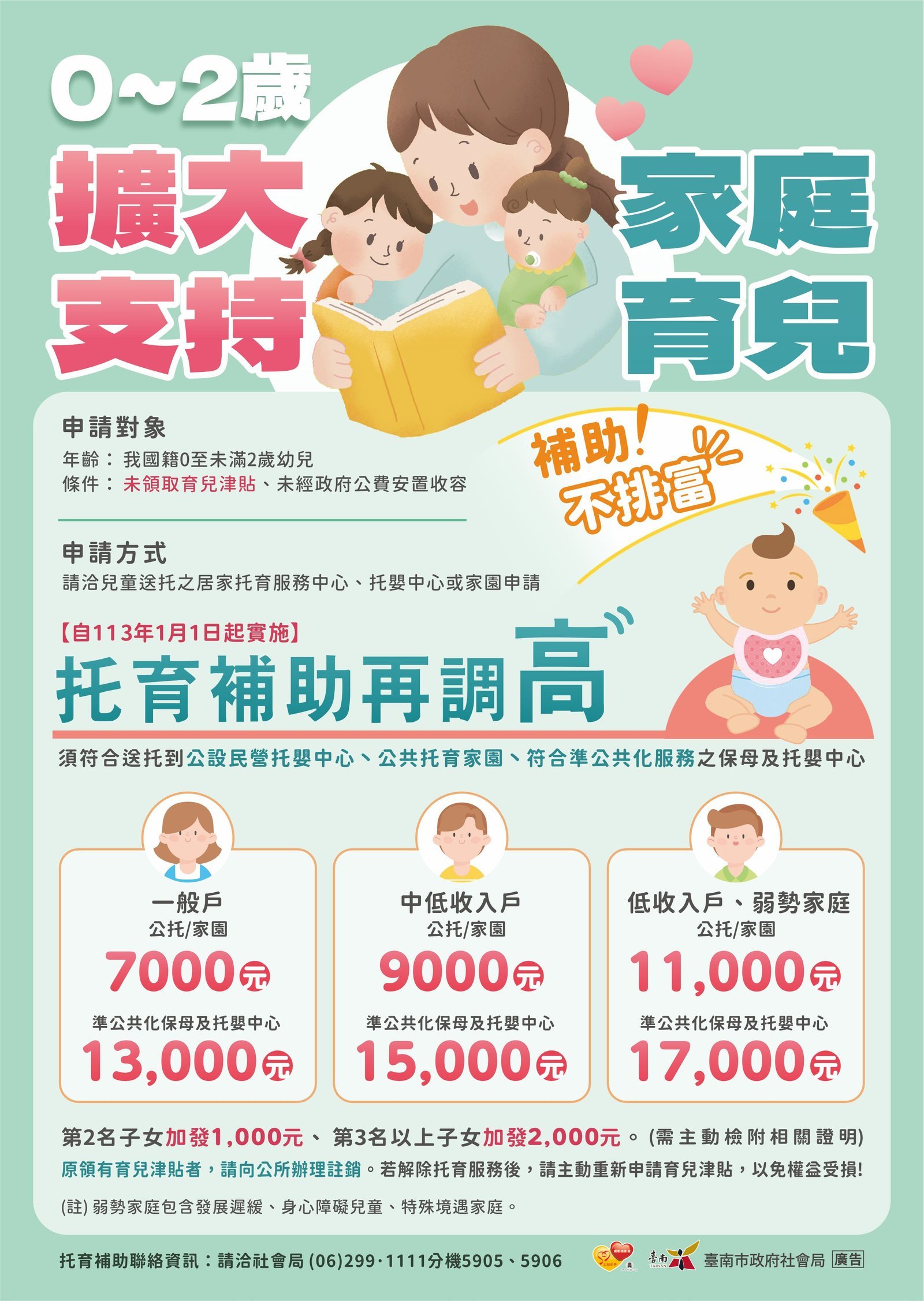 市長黃偉哲表示,今(113) 年1月起送托至準公共化服務之保母及托嬰中心的幼兒, 從每月托育補助8,500元再調高至13,000元( 第2名14,000元,第3名15,000元)。 凡家中育有未滿2歲兒童之家庭,皆可申請育兒津貼或托育補助, 二者不得重複請領。於112年12月正在領取托育補助, 且113年1月仍符合資格者,將自動調整發放金額, 不需另外提出申請。另外特別提醒市民朋友,托育補助屬申請制度, 請符合資格之家庭, 應主動至幼兒送托之居家托育服務中心或托嬰中心提出申請, 以免影響自身權益。