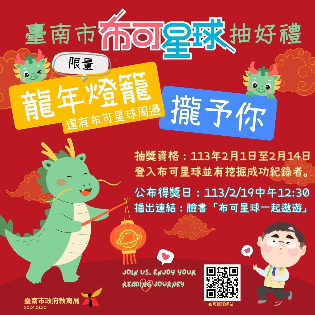 【透傳媒記者杜忠聰/臺南報導】龍年到來,為了和「布可星球」的紛絲們歡慶龍年,教育局辦理「龍喜利來:布可星球獎不完,龍年好運都給你」抽獎活動,自113年2月1日到113年2月14日止,凡期間內登入布可星球並「挖礦」成功的學生,即有機會參加抽獎,獎品包括龍年小燈籠、布可星球專屬布袋、紙袋等,祝大家「龍」運當頭,「閱」讀「閱」幸運。