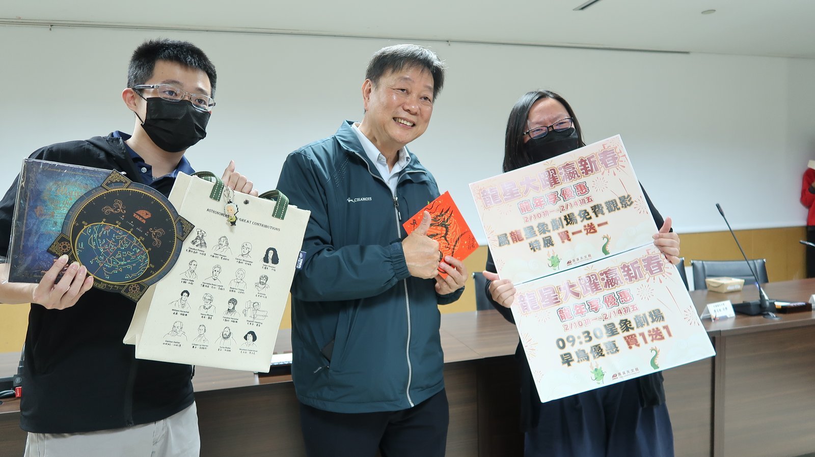 臺南市長黃偉哲表示,今年是臺南400年,臺南從年初開始就精彩活動不斷,春節期間南瀛天文館更是優惠多多,連假期間龍寶寶身分別免費觀賞星象劇場及特展買1送1,再加碼民眾可享劇場第一場早鳥票買1送1優惠、星空小棧促銷福袋及消費滿額贈禮外,更有龍年特色春字春聯供免費索取!同時還有刺激好玩的「威龍闖天關」付費遊戲攤位,本次提供最大獎是AirPods,走過路過千萬不要錯過。