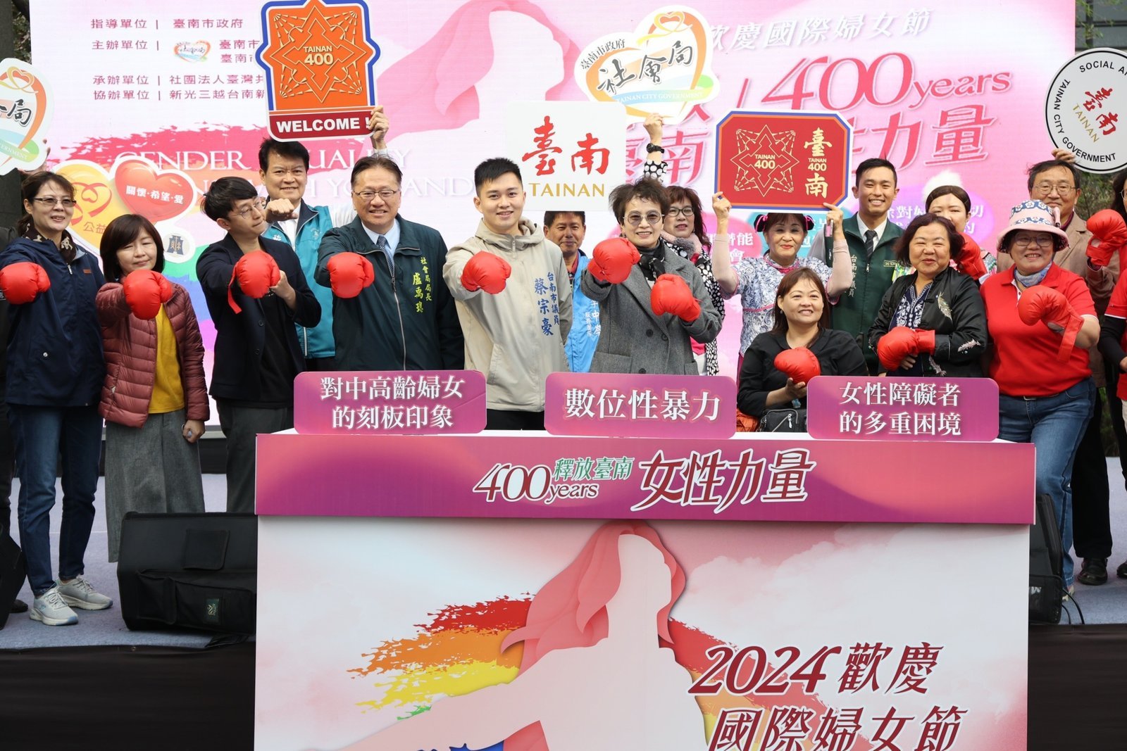 【透傳媒記者杜忠聰/臺南報導】2日在新光三越小西門禾藝道由趙卿惠副市長代表黃偉哲巿長率領社會局盧禹璁局長、各局處及各區公所女性首長共同出席臺南市國際婦女節活動「歡慶2024國際婦女節-釋放臺南400年女性力量」啟動儀式,響應國際婦女節,同時讓更多民眾瞭解市府推動的各項婦女權益與服務,活動趙副長偕同市府局處長官戴上手套,代表和市民同一陣線齊心擊倒性別偏見、打破歧視,並宣示臺南市致力提升婦女福利,推動女性族群間的平權倡議、社會參與、性別平等與多元族群,呼籲女性朋友從心覺醒,相互激勵共融,推動善與愛的正向循環。